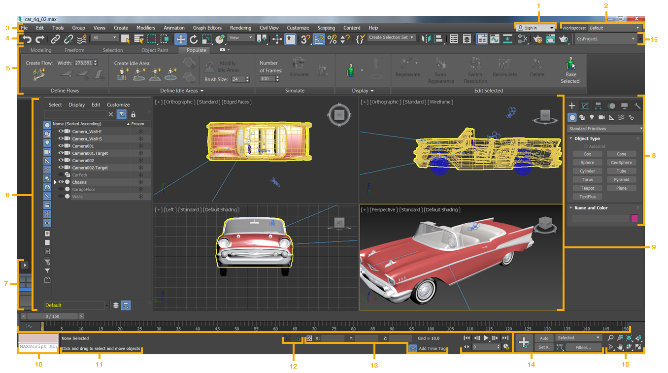 3ds Max arayüzü , üzerinde çalıştığınız ve sahnenizi görüntülediğiniz kontrolleri, durum bilgilerini ve görüntüleme pencerelerini içerir.