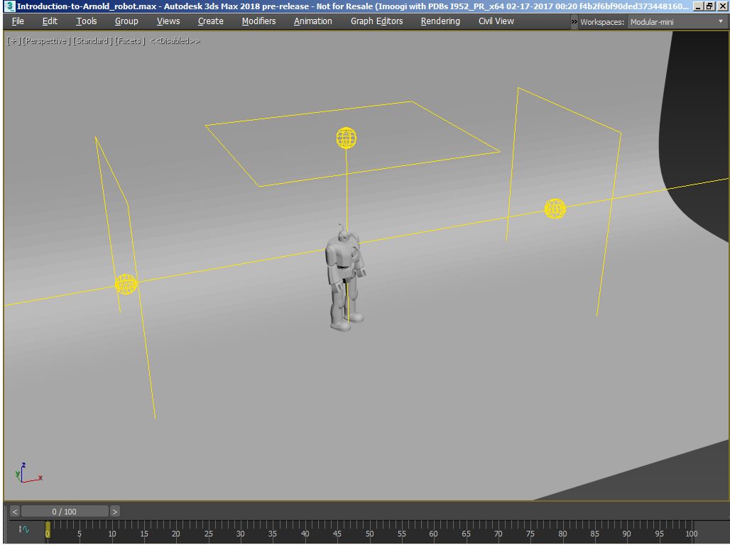 - Öncelikle robot sahnesini açın . Sahnede, robot modelini (3ds Max ızgarasında 0,0,0 konumunda) ve basit bir stüdyo arka plan modelini görmelisiniz.