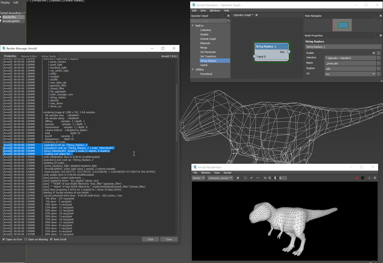 Bir ASS dosyası veya ABC dosyası yüklenmeden önce dosya yollarını güncellemek için bir operatör kullanabilir, ardından bu prosedür tarafından yüklenen geometriyi değiştirmek için başka bir operatör kullanabilirsiniz. Örneğin, render zamanında ‘trex_proxy.abc’ dosyasını ‘trex.abc’ ile değiştirmek istediğinizi varsayalım. Bunu bir Dize Değiştirme operatörüyle kolayca yapabilirsiniz: