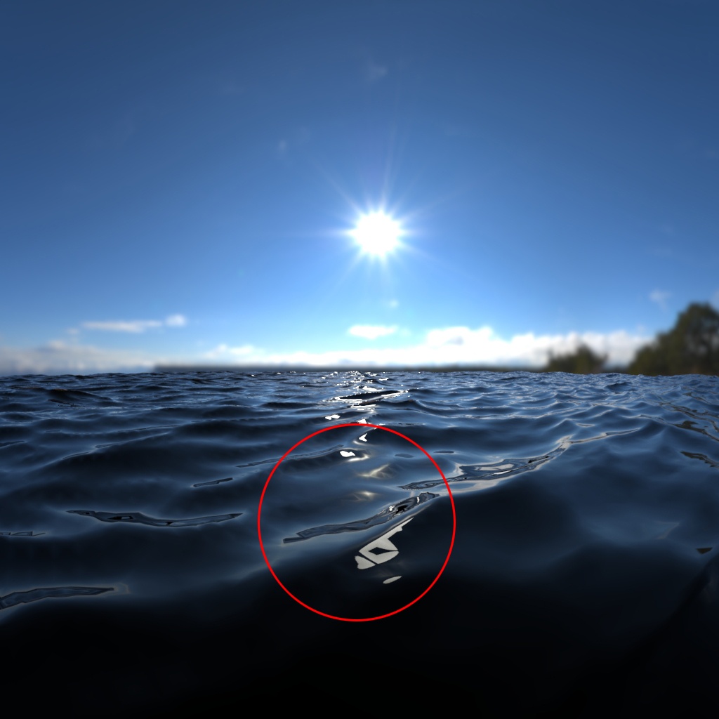Yüzey, düşük açılardan bakıldığında neredeyse %100 yansıtıcıdır, ancak yine de ışığın dalga tepesinin arkasındaki vadiden çıkması birkaç kez yansıma gerektirebilir ve birkaç yansımadan sonra bile, çevredeki suyun yansıttığından daha yüksek bir noktadaki bir şeyi yansıtabilir.