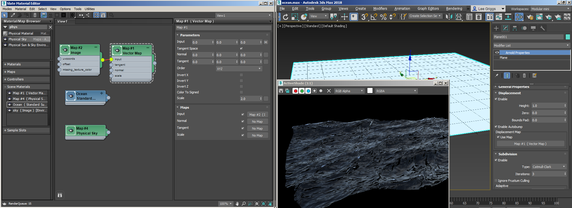 - Bir vector_map gölgelendirici oluşturun ve okyanus vektör yer değiştirme haritasını ( vector-displacement_sea.exr ) giriş parametresine bağlayın. Vector_map dosyasını Arnold Properties Modifier’ın Displacement Map parametresine sürükleyip bırakın.
