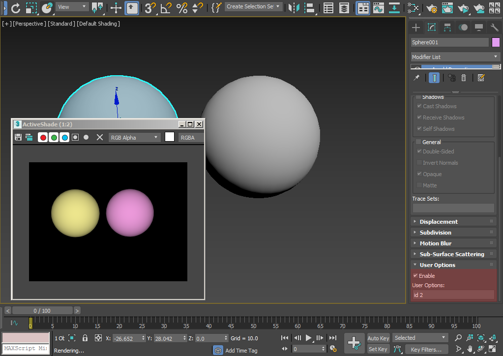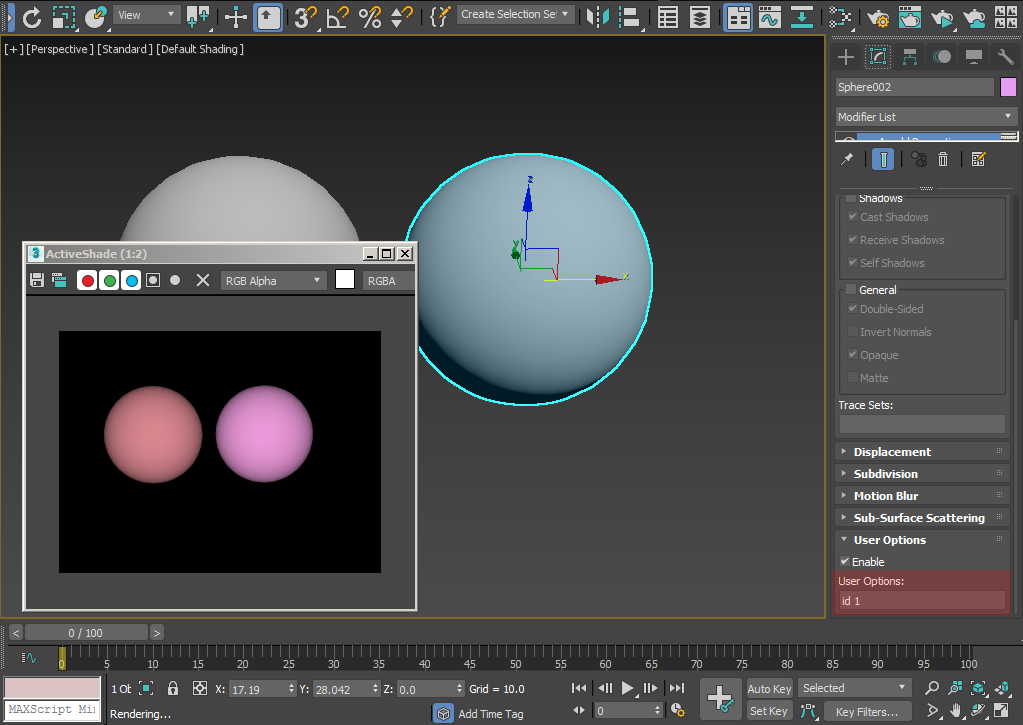 - Kürelerden birine Arnold Özellikleri Değiştirici nesne değiştirici ekleyin . Kürenin Arnold Özellikleri’ndeki Kullanıcı Seçenekleri parametrelerine gidin. Etkinleştir’i seçin ve Kullanıcı Seçenekleri’ne ‘ id 1 ‘ girin . Aşağıdaki işlenmiş kare penceresinde soldaki kürenin kimlik renginin değiştiğini görebilirsiniz: