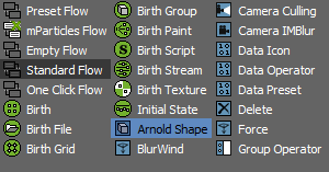 Arnold G örneklerinin kullanımına olanak sağlayan bir Arnold Şekil operatörü, Parçacık Görünümü penceresinde (Grafik Düzenleyiciler) mevcuttur .