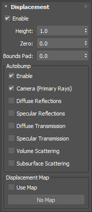 Aşağıdaki yer değiştirme ayarları, geometri nesneleri için Arnold Properties Modifier nesne değiştiricisi aracılığıyla sağlanmaktadır.