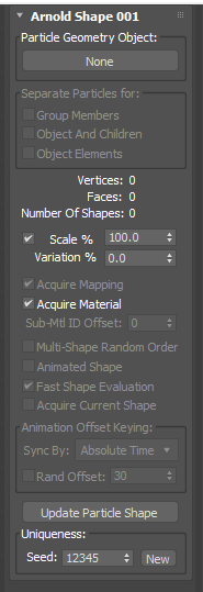 Particle Flow sisteminde , Arnold Properties Modifier, sistemin kendisine değil, olaya (render bilgilerini tutan nesneye) uygulanmalıdır.