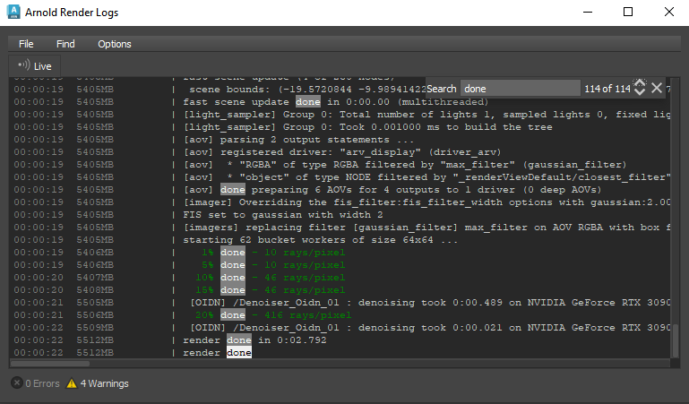 Arnold Render Günlükleri penceresini açar; burada Arnold günlüklerinin okunması kolay bir sürümünü görüntüleyebilirsiniz .