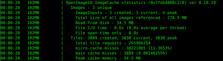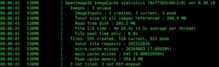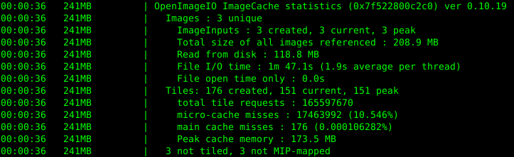 Doku dosyaları kullanıldığında, günlük dosyası OpenImageIO ImageCache’den alınan istatistikleri görüntüler.