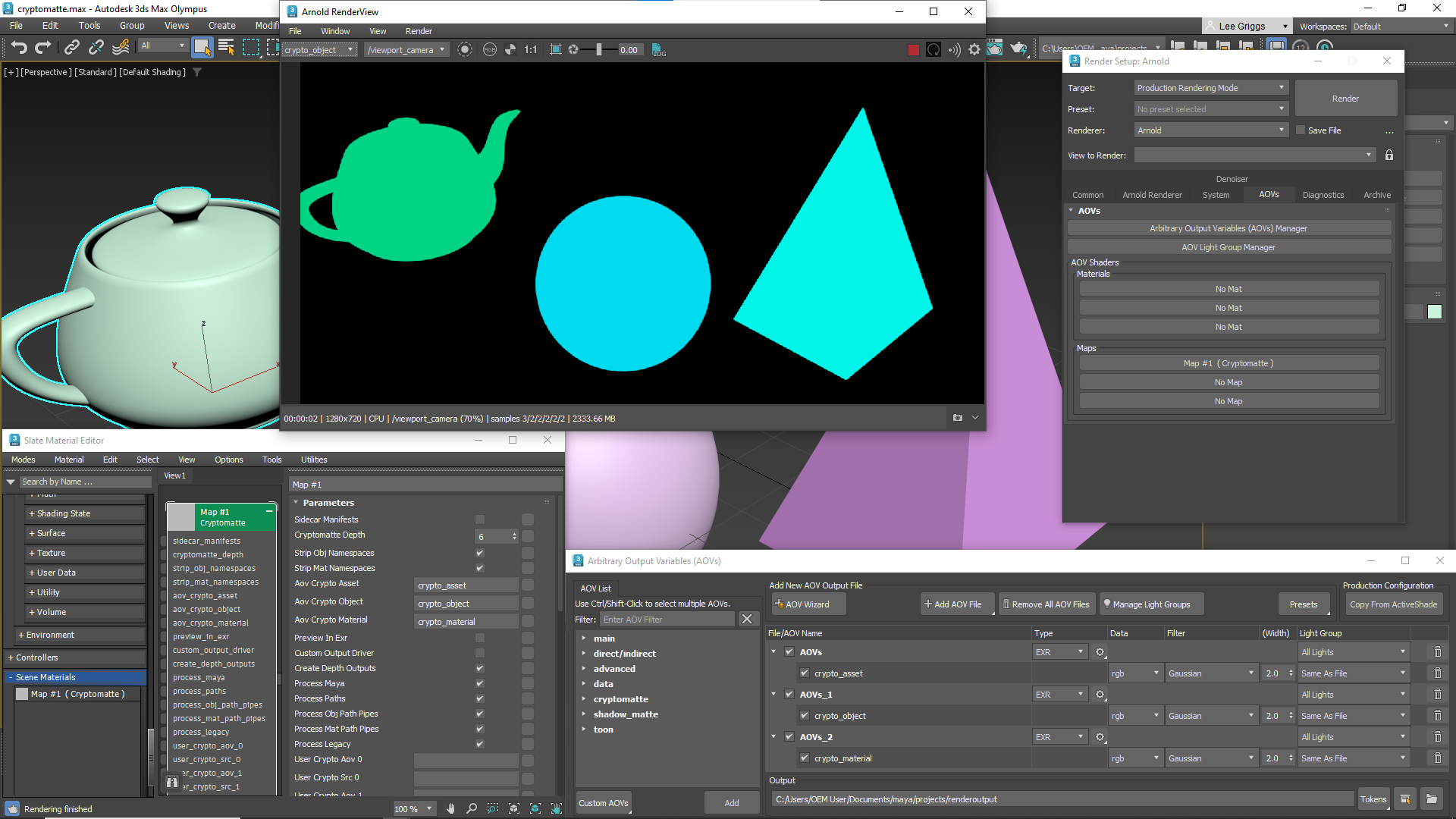 Not: Cryptomatte gölgelendiricisinin ayarlarını düzenlemeniz gerekiyorsa, AOV Gölgelendiricileri altındaki Harita yuvasından Slate Malzeme Düzenleyicisine sürükleyin (Örnek’i seçtiğinizden emin olun).