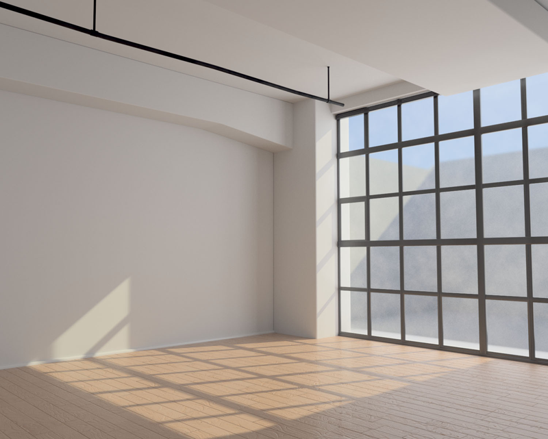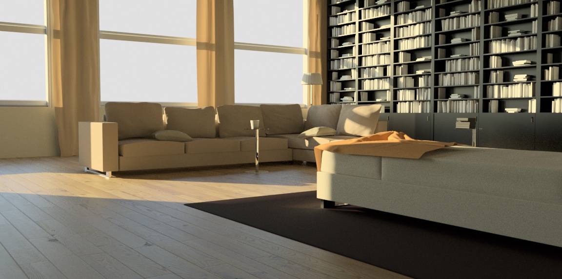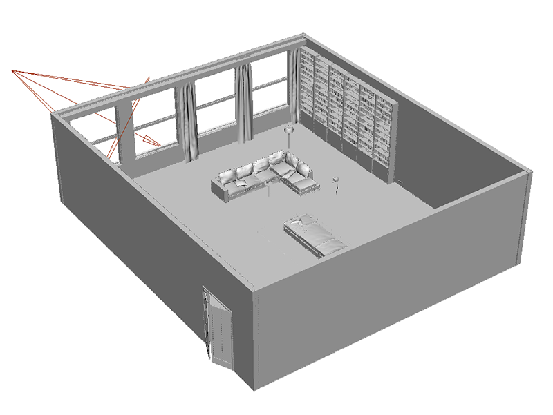 - IPR, sahneyi oluşturur ve güneşin pencereden girip en sağdaki duvara ve zemine vurması için Yükseklik ve Azimut ayarlarını düzenler. Bu durumda, Yükseklik oldukça düşüktür (15) ve Azimut, güneş ışığının en uzaktaki duvara vurması için açılı olarak ayarlanmıştır (143).