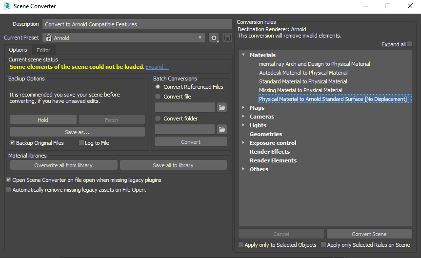 Dahili Fiziksel malzemeleri Arnold Standart Yüzey gölgelendiricilerine dönüştürmek için Sahne Dönüştürücüyü (Renderlama -> Sahne Dönüştürücü…) kullanacağız .