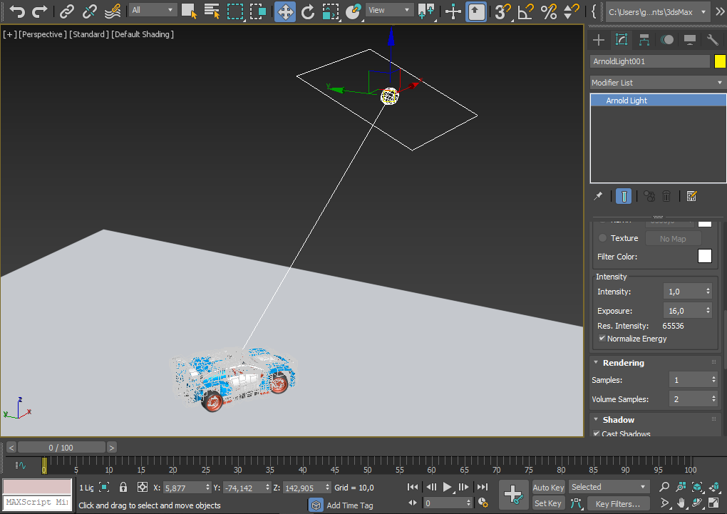 - Oluştur sekmesindeki (Komut Paneli) ışıklara gidin ve menüden Arnold’u seçin . Arnold Işığı’nı ( varsayılan olarak Dörtlü Işık ) seçin ve oluşturmak için görünüm alanına tıklayın. Aşağıdaki resimde olduğu gibi, arabadan biraz daha büyük olacak şekilde konumlandırın, yönlendirin ve ölçeklendirin.
