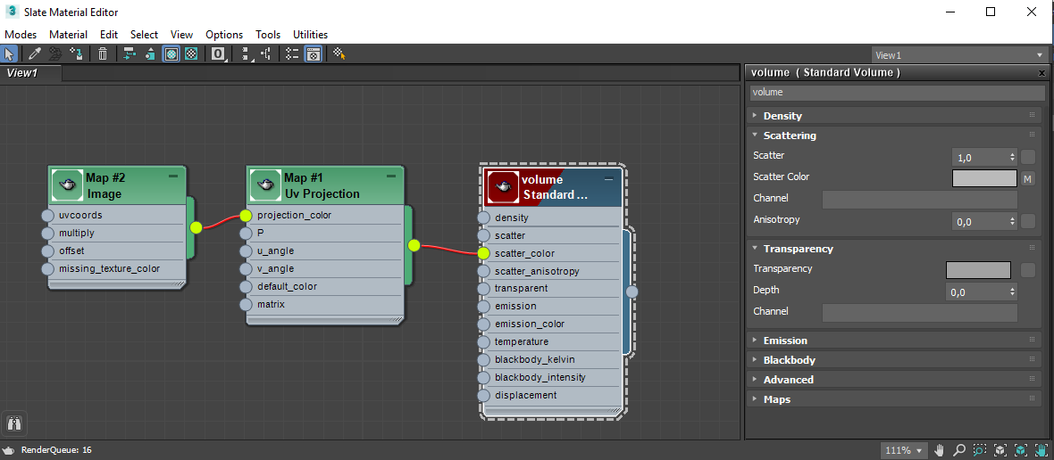 - Orijinal uv_projection’ı standard_volume shader’ının scatter_color’ına bağlayın .