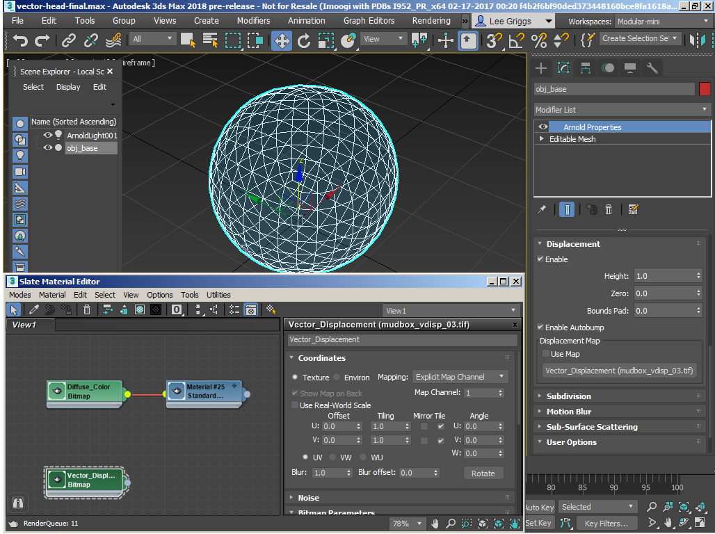 - Bir Bitmap dokusu oluşturun ve vektör yer değiştirme haritasını ( mudbox_vdisp.tif ) açın. Vektör yer değiştirme bitmap dosyasını Arnold Properties Modifier’ın Displacement bölümündeki Displacement Map parametresine sürükleyip bırakın .