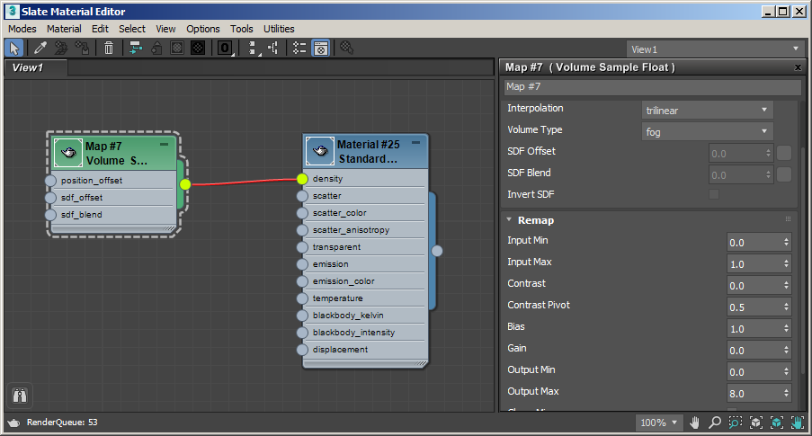 - Bir `volume_sample_float` gölgelendiricisi oluşturun . Bunu `standard_volume` gölgelendiricisinin `density` parametresine bağlayın .