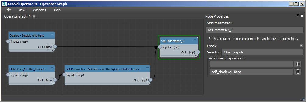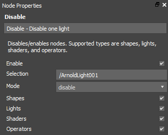- Bir Devre Dışı Bırakma operatörü oluşturun ve Seçim bölümüne aşağıdaki Arnold ışığını girin: