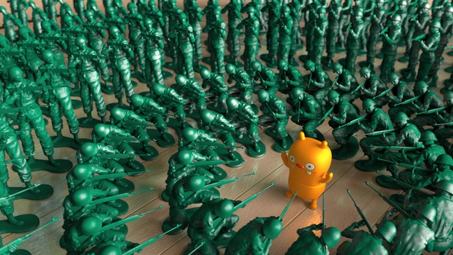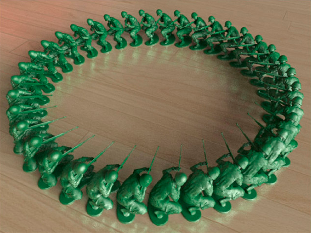 Prosedürel modeller, render işlemine çok az ek yük getirerek birçok kez örneklendirilebilir (orijinal model yaklaşık 20.000 poligondan oluştuğu için, prosedürel modeller kullanılmadan yüzlerce askerin yer aldığı aşağıdaki sahne oldukça büyük olurdu). Arnold’ın ise sahneyi render etmede hiçbir sorunu yok elbette.