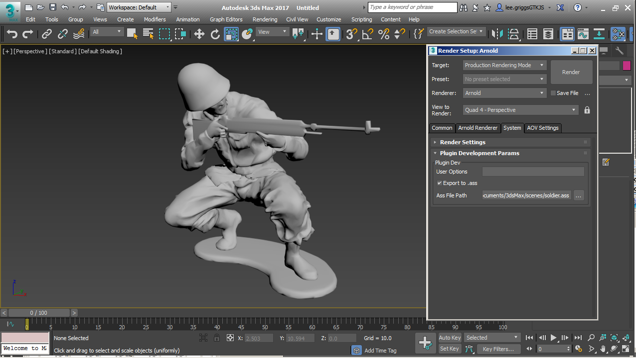 - Arnold’ın Prosedürel düğümünü kullanarak çoğaltmak istediğiniz modeli açın . Modeli dışa aktarmadan önce modelinizin ve gölgelendirmesinin tamamlandığından emin olun, çünkü dışa aktardıktan sonra değiştiremeyeceksiniz. Modeli dışa aktarmak için, Oluşturma Kurulumu penceresindeki Sistem sekmesine gidin . .ass olarak dışa aktarmayı etkinleştirin .