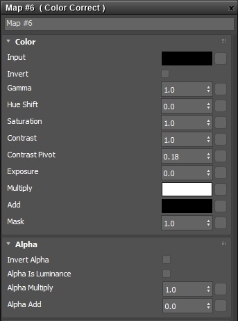 `color_correct` düğümü , bir görüntünün gama, ton, doygunluk, kontrast ve pozlamasını ayarlamanıza olanak tanır . Giriş rengini, parametrelerle aynı sırada uygulanan aşağıdaki operatörle değiştirir.
