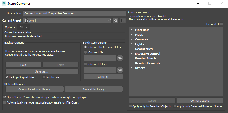 - “Sahneyi Dönüştür” seçeneğini seçin . Komut dosyası, Autodesk Materyallerini Fiziksel gölgelendiricilere, Gün Işığı/Pozlamayı Güneş Konumlandırıcıya ve Fiziksel Gökyüzüne ve kameraları Fiziksel Kameralara dönüştürecektir. Max Photometric ışıkları artık Arnold’da desteklenmektedir, bu nedenle değiştirilmelerine gerek yoktur.