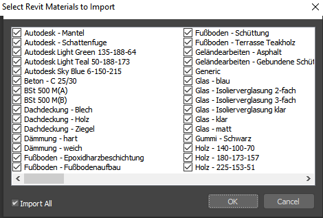 - Geometri yüklendikten sonra, tüm Revit malzemelerini içe aktarmak için “Tümünü İçe Aktar”ı seçin . Sahnenin orijinal olarak Almanca tasarlandığını ve bu nedenle malzeme adlarının da Almanca olacağını unutmayın.
