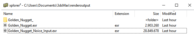 - Sahneyi render edin. Arnold, güzellik dosyanızın yanı sıra, gürültü giderme için gerekli AOV’leri de içeren bir EXR sürümünü kaydedecektir. Bunlar, güzellik dosyasının adıyla eşleştirilmiş ve sonuna “_Noice_Input” eklenmiştir.