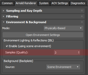 - Gölgelerde herhangi bir gürültü fark ederseniz, Render Setup penceresindeki Arnold Renderer sekmesinde bulunan Environment & Background altındaki IBL için Örnek (Kalite) sayısını artırmayı deneyin .