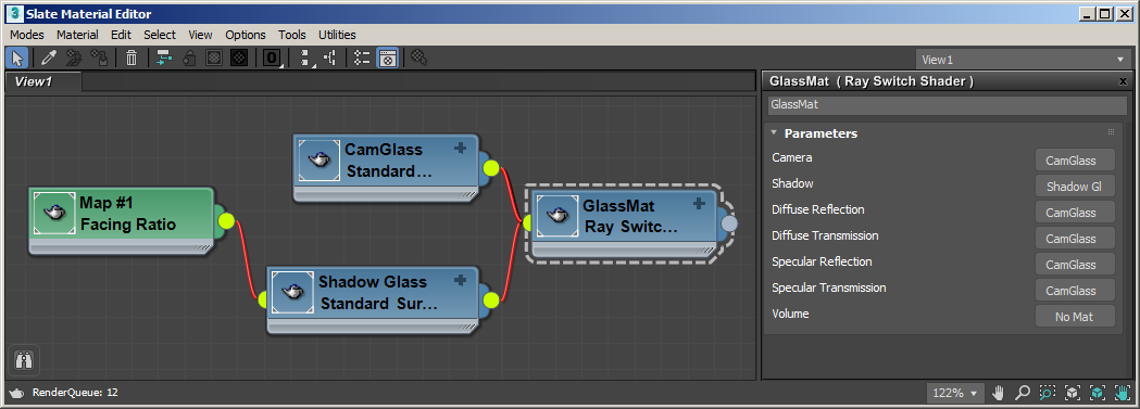 Ardından, bir Ray Switch gölgelendirici oluşturun ve nesneye atayın. Adını GlassMat olarak değiştirin. Bu, Arnold’a cam nesneyi işlerken hangi ışınları kullanacağını söylemek için kullanılacaktır.