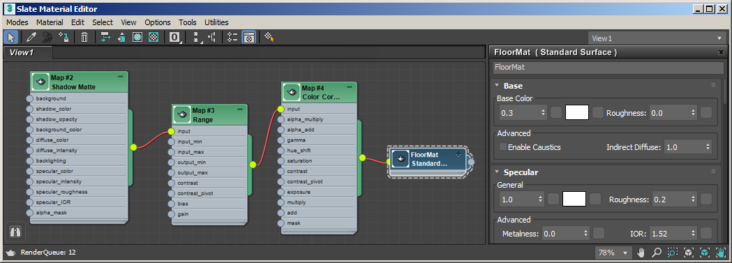 - İkinci bir Standart Yüzey gölgelendirici oluşturun ve adını FloorMat olarak değiştirin. Bunu zemin düzlemi geometrisine atayın. Aşağıdaki parametreleri değiştirin: