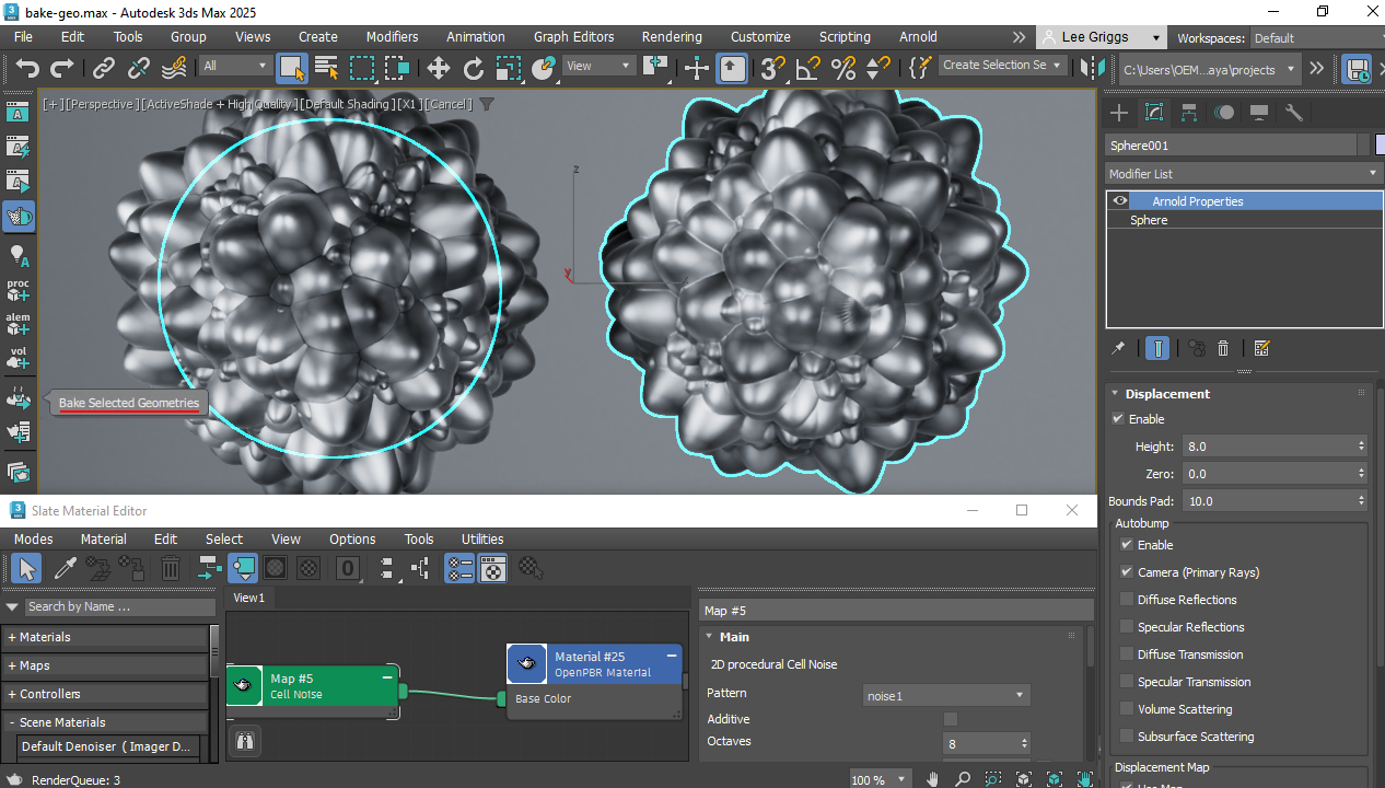 Bölümlere ayrılmış ve yer değiştirmiş geometrileri .ass veya .usd dosyasına dönüştürür. Bu seçenek Arnold araç çubuğunda ve Arnold Menüsünde de bulunabilir .