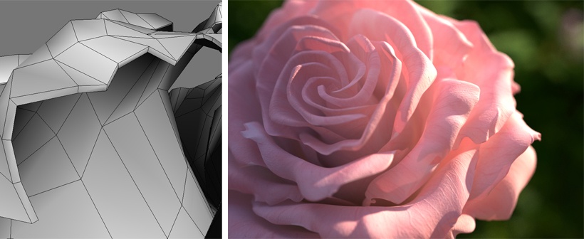 Daha iyi ve ‘fiziksel olarak daha doğru’ bir yöntem, yaprakları dışa doğru uzatarak geometriye az miktarda kalınlık eklemektir . Soldaki resimde yapraklar yalnızca tek taraflıdır. Oluşturulduğunda, yapraklar kağıt kadar ince görünür (yaprakların geri saçılan bölgelerinde daha belirgindir). Sağdaki resim, yapraklara derinlik eklendiğinde elde edilen sonuçları göstermektedir. Yapraklar artık oluşturulduğunda bir miktar kalınlığa sahip gibi görünmektedir.