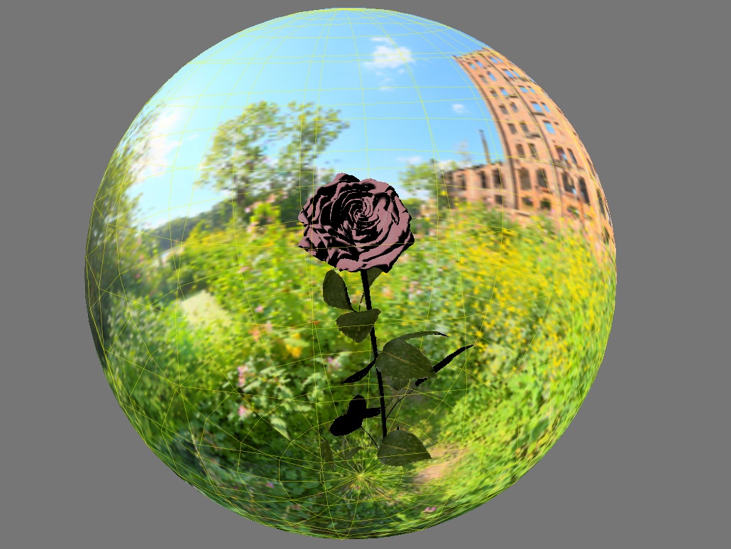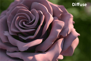 Aşağıdaki animasyonlu GIF, difüz (base_color) , speküler (yüksek speküler pürüzlülük ile ) ve yüzey altı (sss) saçılımının gülün görünümü üzerindeki etkisini göstermektedir. Sahne, kameraya doğru yönlendirilmiş bir yönlü ışıkla aydınlatılarak yarı saydam bir arka aydınlatma efekti ve renk özniteliğine bağlı bir gökyüzü HDR haritasına sahip bir skydome_light oluşturulmuştur.