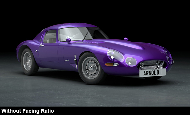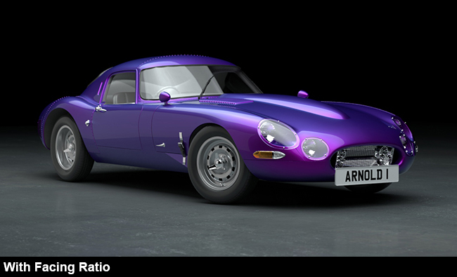 Yüzey Oranı, otomobil boyası için sedefli bir renk kaplaması oluşturmak için faydalı olabilir. Aşağıdaki örnekte, Standart Yüzey gölgelendiricisine Kaplama Rengi eklenmiştir . Bu durumda, Yüzey Oranı gölgelendiricisi Kaplama Ağırlığına bağlanmış ve Kaplama Rengi etkisini abartmak için kullanılmıştır .