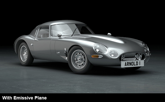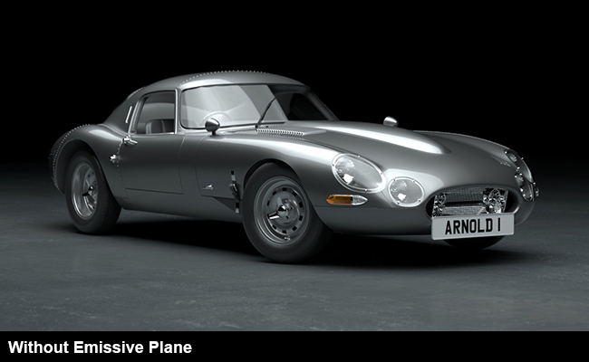 Aracın yan tarafına yansıma ve aydınlatma eklemek için yansıtıcı beyaz bir düzlem yerleştirilmiştir. Bunun nedeni, genellikle araç fotoğrafçılarının ışıkları doğrudan araca değil, araç boyasında yansıyan yüzeylere tutmalarıdır. Bu durumda, Emisyon Ağırlığı 0,5’tir. Elbette, Emisyon Rengine bir doku da atayabilirsiniz . Ancak, bu durumda beyaz bir Emisyon Rengi yeterlidir.