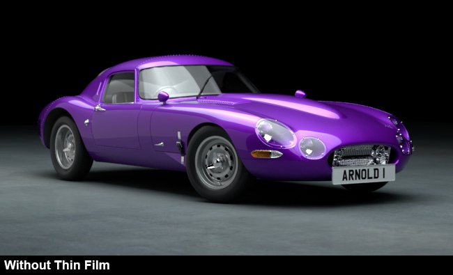 Standart Yüzey gölgelendiricisindeki İnce Film seçeneği, çok tonlu bir araba boyası malzemesi oluşturmak için de kullanılabilir ( Kalınlık : 400, IOR : 1.43).