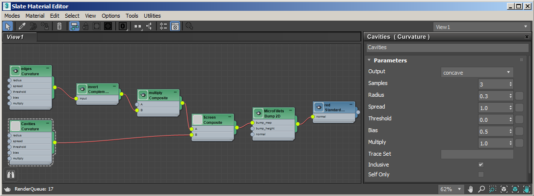 - Eğrilik gölgelendiricisini çoğaltın ve çıktısını dışbükey olarak ayarlayın . Bunu kompozitin (ekranın) B girişine bağlayın .